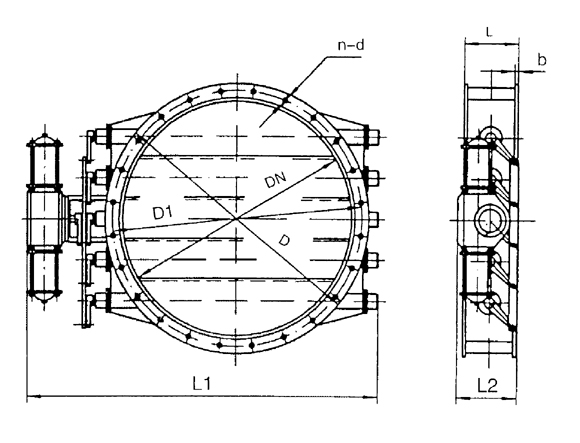 DN | D | D1 | L | L1 | L2 | b | n-d | 氣動(dòng)裝置 | 風(fēng)機(jī) | 重量(kg) |