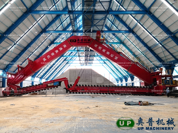 門式刮板取料機對物料的適應性較強,適用于各類型物料包括粘濕物料。門架式的取料機結構極大地節約了料場空間,同時作業不受料堆限制,可隨時快速到達任意料堆取料,滿足單個料場布置多種物料多個料堆的需求。門架取料機設計跨度大,可實現大儲量、高產能,整機載荷小。
