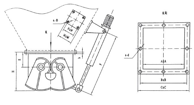 腭式閘門由本體、扇形閘板、軸、齒輪、密封件、執行機構等部件構成。手動或執行機構推動搖桿,使齒輪帶動扇形閘板沿軸心旋轉,使兩個扇形閘板向兩邊開啟,物料隨即下落,待接料裝置滿載后,再由執行機構帶動搖桿,使扇形閘板復位,關閉截斷下落的物料。