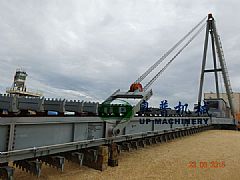 該變幅裝車機系統由平形膠帶機、卸袋機構、端部溜槽、中間溜槽等組成。變幅裝車機的平形膠帶機的支架采用鋼板折彎結構,即美觀又牢固;驅動裝置采用擺線針輪減速機,節省占地面積;張緊方式為中間垂直螺旋張緊。變幅裝車機的卸袋機構由轉臂立式膠帶機、電動推桿和支架三部分組成,當不需要水泥袋從中間位置卸下時,立式膠帶機處于包裝膠帶機的側邊;當需要水泥袋從中間位置卸下時,由電動推桿拉動立式膠帶機使其擺動與包裝膠帶機縱向成交叉位置,并開動立式膠帶機即可。變幅裝車機的立式膠帶機的兩個擺動極限位置設有限位開關,其在工作和非工作狀態下的定位由限位開關來實現。特殊設計的溜槽能使水泥袋恰好落到膠帶機的中心位置。
