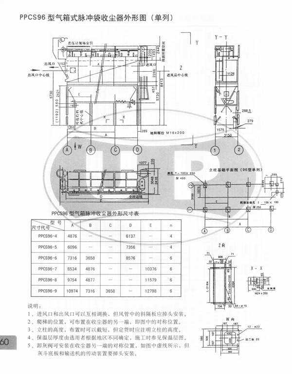 PPCS96型氣箱式脈沖袋收塵器技術性能表
