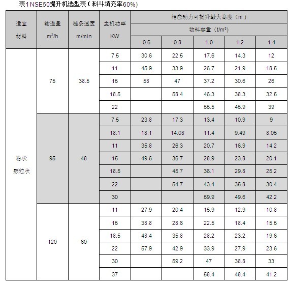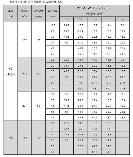 NSE系列高速板鏈斗式提升機共有九種基本型號:NSE100、NSE200、NSE300、NSE400、NSE500、NSE600、NSE700、NSE800、NSE1000,每種型號根據輸送物料的不同,選擇不同的提升速度,提升速度上限<70m/min,提升高度上限65m。另外,奧普公司還可根據用戶要求輸送量介于上述型號之間的擴展型號。