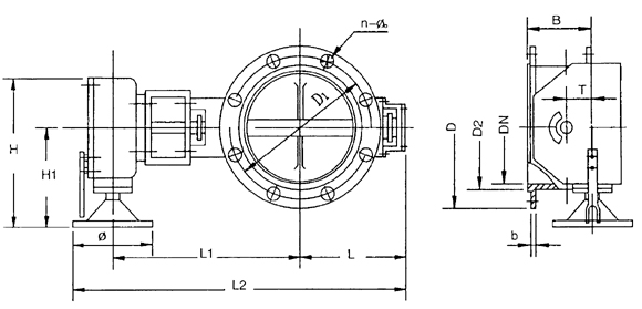 | DN | D | D1 | D2 | N-Φ。 | H | H1 | L | L1 | L2 | b | B | T | Φ |