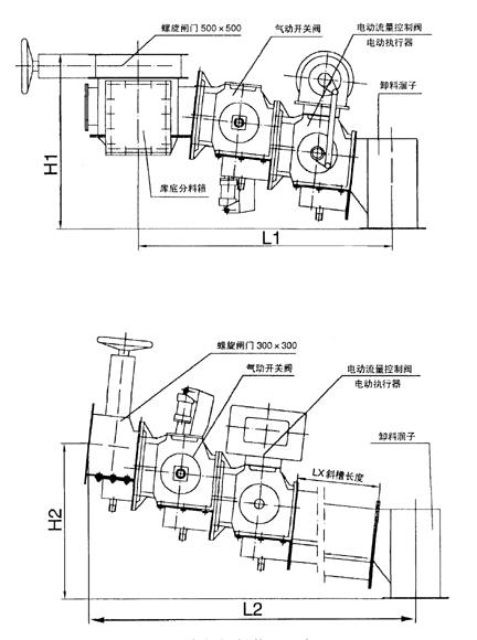 庫底卸料裝置由庫底螺旋閘門、庫底分料箱、電動(氣動)開關閥、電動流量控制閥及卸料溜子組成,用于水泥生料粉或水泥的庫底卸料。庫底卸料裝置能自動調節卸料流量且均勻,其結構合理,操作維護簡單方便,可設三個卸料口,用戶也可選用庫側卸料裝置。
